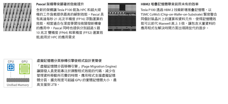 Tesla P100 從硬體到軟體均重新設計,在每個設計環節都加入創新元素。每項劃世代技術都展現效能的大躍進,促成全球最快運算節點的誕生。