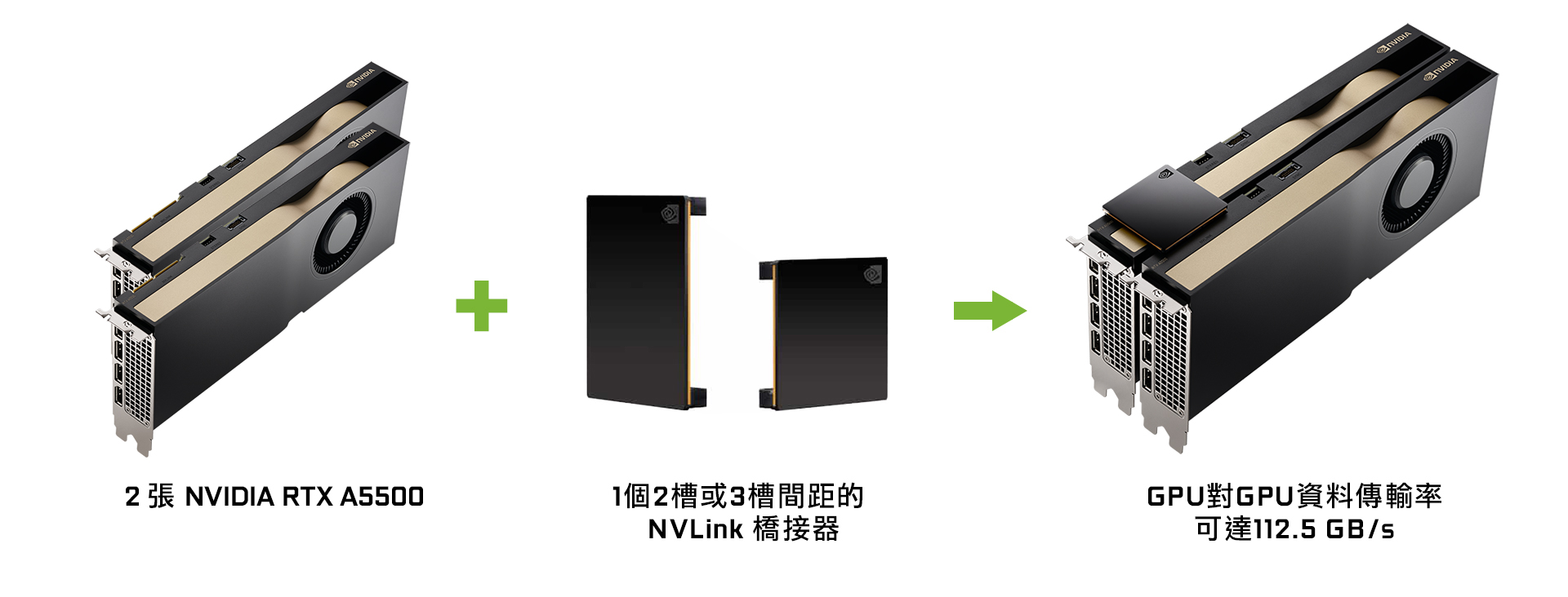 透過以高達112.5 GB / s(總頻寬)的速率實現GPU到GPU的數據傳輸,將兩張RTX A5500卡與NVLink相連,可以有效將記憶體空間增加一倍,並擴展應用程式效能。
