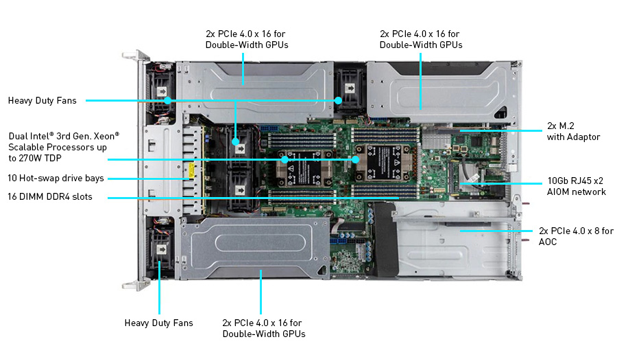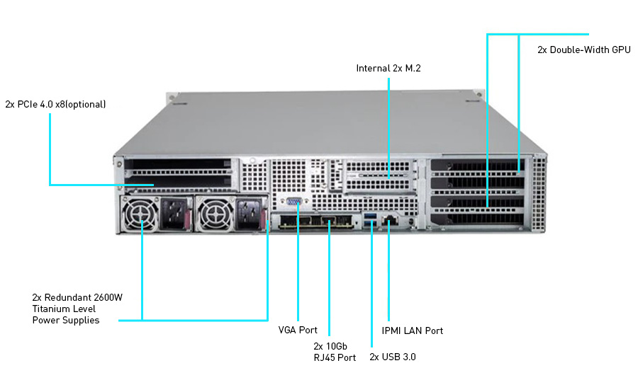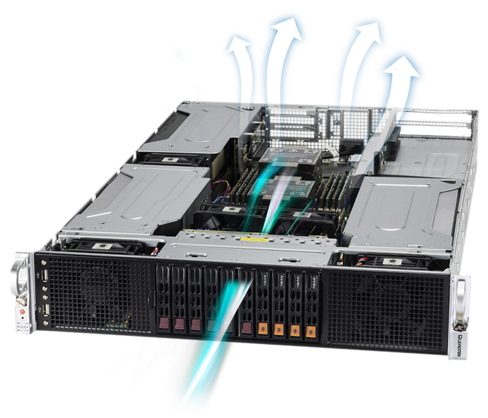 WinFast GS2040T 可支援多達 6 個無風扇雙寬度GPU, 如NVIDIA A100/A40/A30/A10 或 4個內建主動型風扇的NVIDIA RTX A6000/A5000, 發揮多 GPU的運算效能, 符合 AI 深度學習/3D繪圖/模擬等應用的需求。