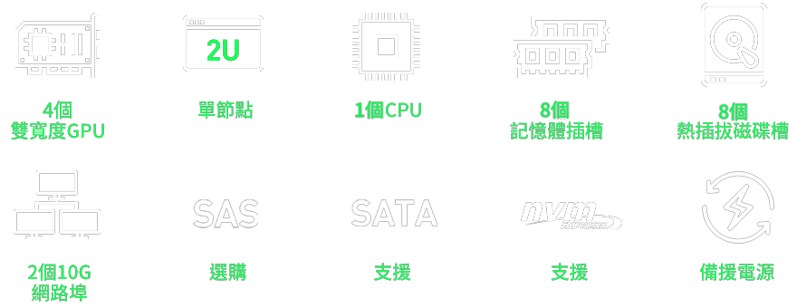 WinFast GS2055 ST 可支援多達 4 個無風扇雙寬度GPU, 如NVIDIA H100/L40S 或 4個內建主動型風扇的NVIDIA RTX 6000 Ada/5000 Ada/4000 Ada, 發揮多 GPU的運算效能, 符合 AI 深度學習/3D繪圖/模擬等應用的需求。