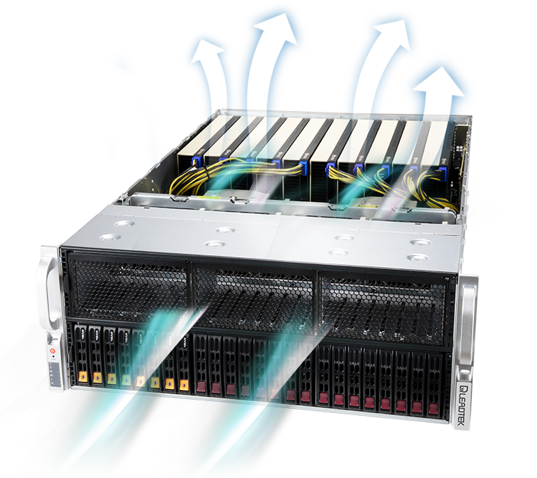 WinFast GS4850T 可支援多達 10 個雙寬度GPU的高效能伺服器, 可以支援 NVIDIA GPU, 包括 H100/A100/A40/A30/A10/A6000/6000 Ada 並可以搭配 NVLink 橋接器, 擴展多 GPU的運算效能, 符合 AI 深度學習/3D繪圖/模擬等應用的需求。