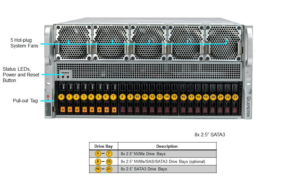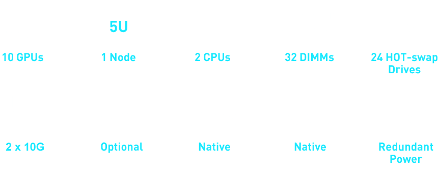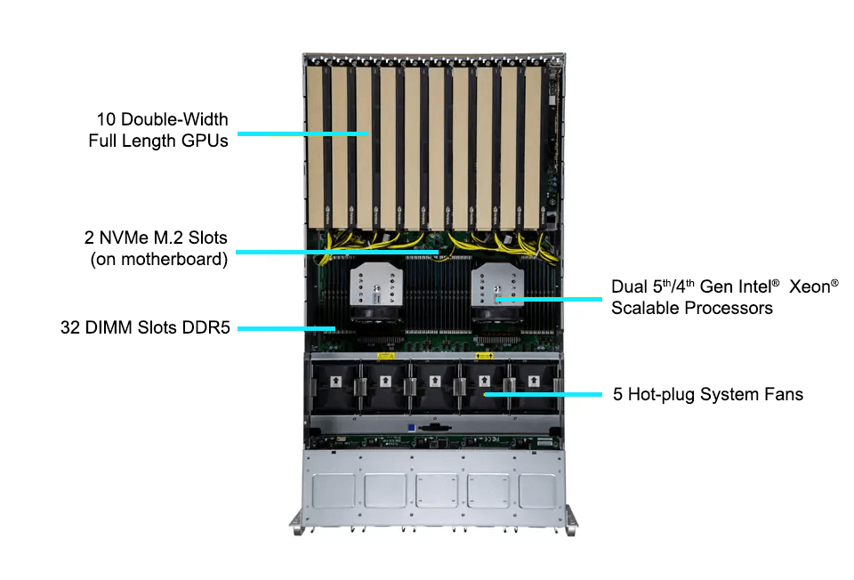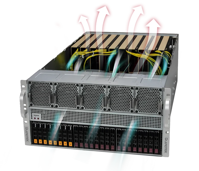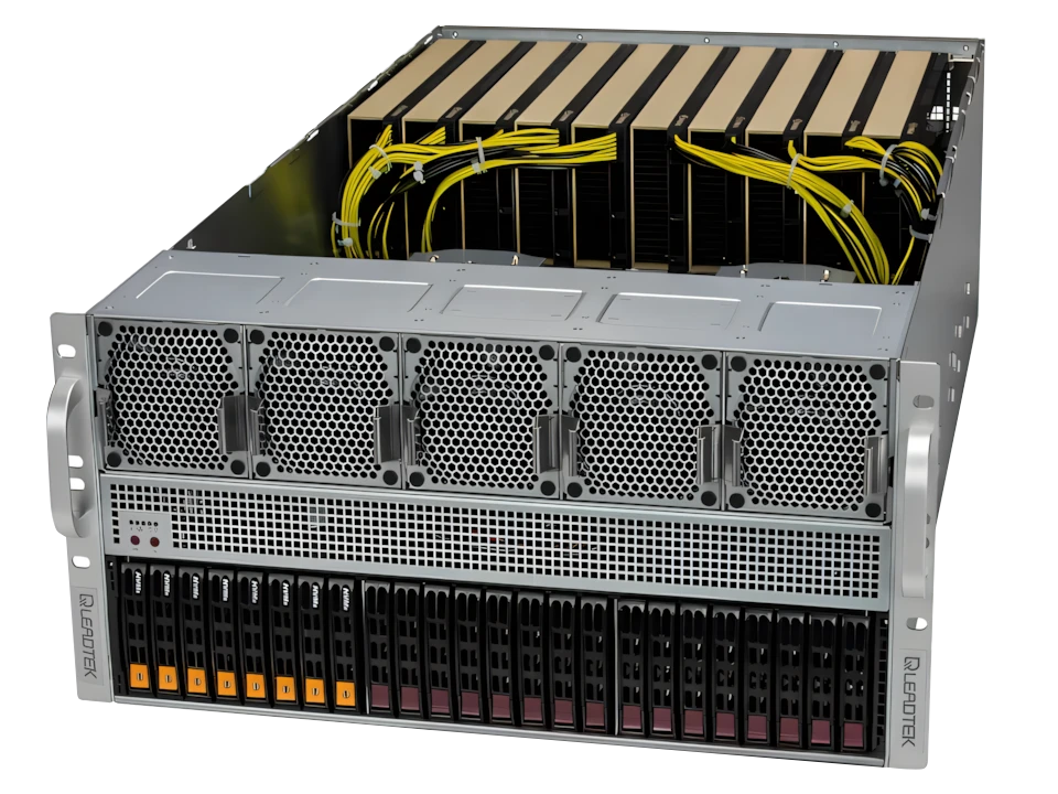 WinFast GS5850T 可支援多達 10 個雙寬度GPU的高效能伺服器, 可以支援 NVIDIA GPU, 包括 H100 NVL, H200 NVL (141GB), RTX 6000 Ada Generation, L40S, L4 並可以搭配 NVLink 橋接器, 擴展多 GPU的運算效能, 符合 AI 深度學習/3D繪圖/模擬等應用的需求。