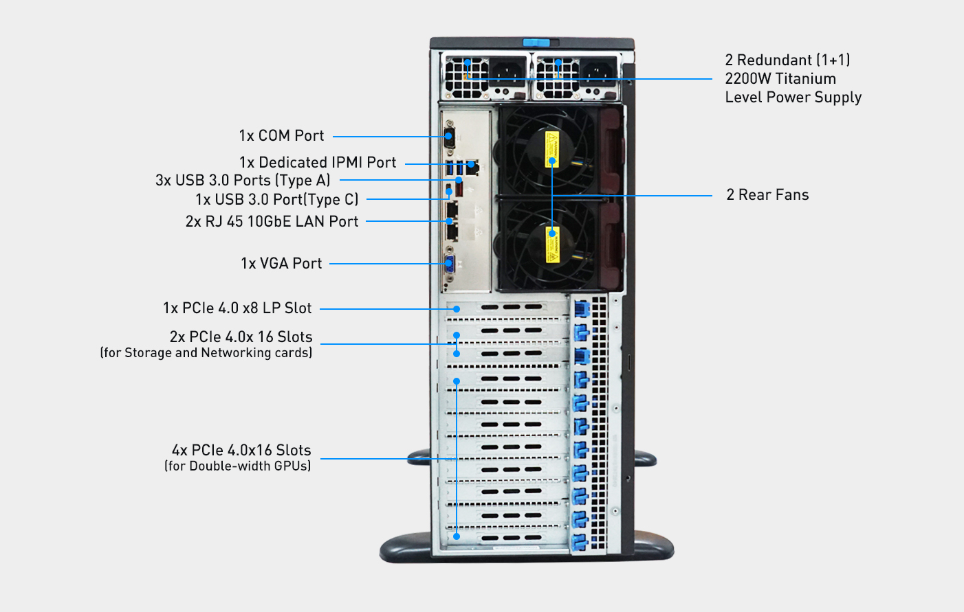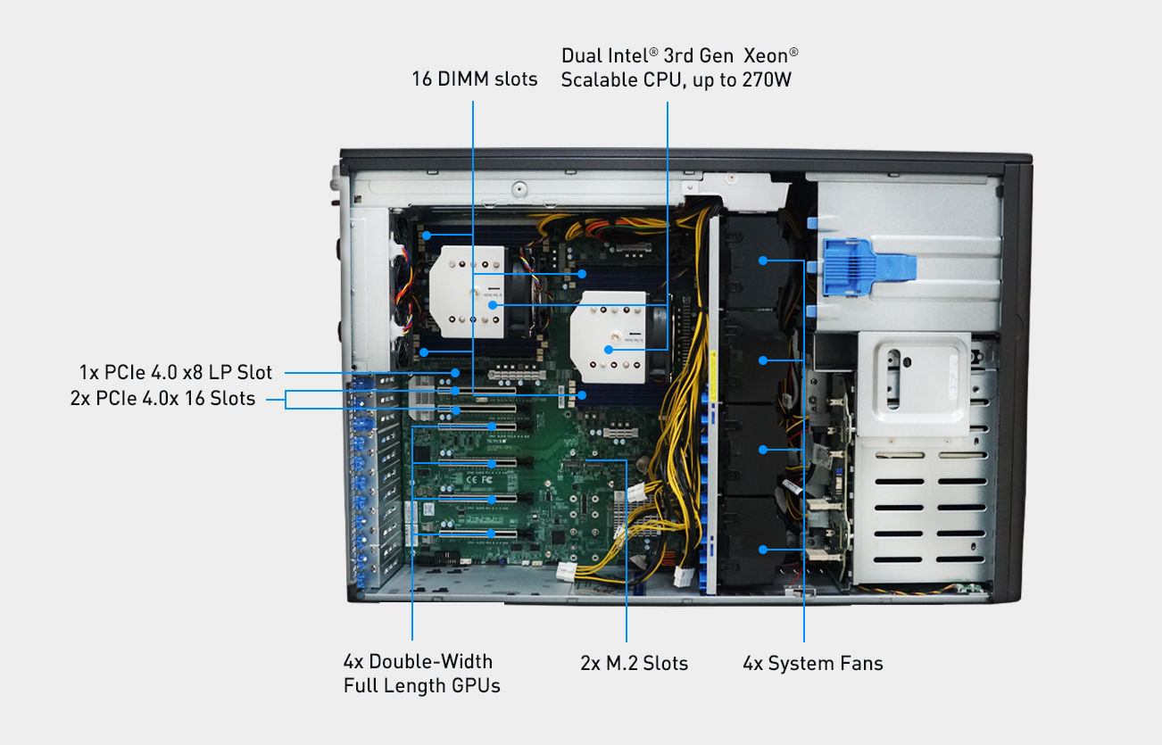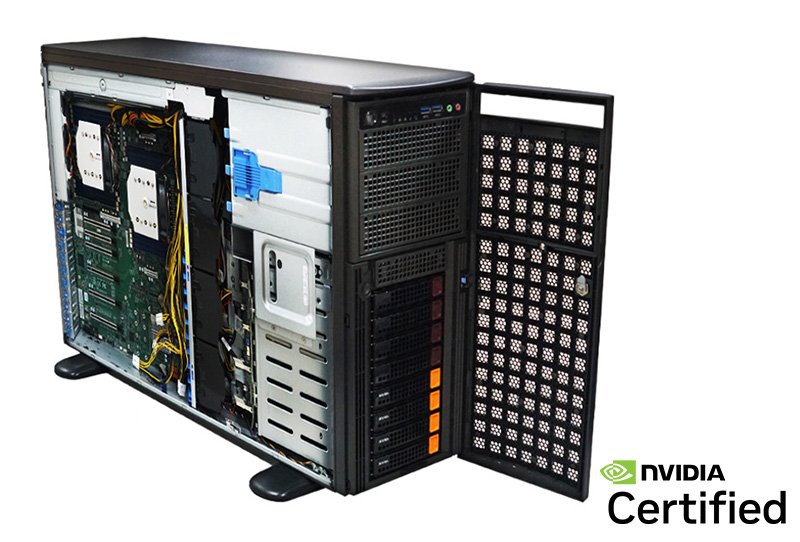 WinFast WS2040 可支援多達 4 個雙寬度GPU的超級工作站, 可以支援 NVIDIA Ampere 架構, Tesla 或 Quadro 系列的 GPU, 並可以搭配 NVLink 橋接器, 擴展多 GPU的運算效能, 符合 AI 深度學習/3D繪圖/模擬等應用的需求.