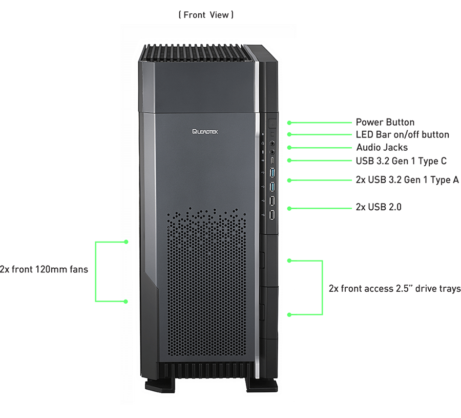 | USB | Front side: 1x USB 3.2 Gen 1 Type C 2x USB 3.2 Gen 1 Type A 2x USB 2.0 Rear side: 5x USB 3.2 Gen2 Type A 1x USB 3.2 Gen2x2 Type C 2x USB 3.2 Gen 1 Type A |
