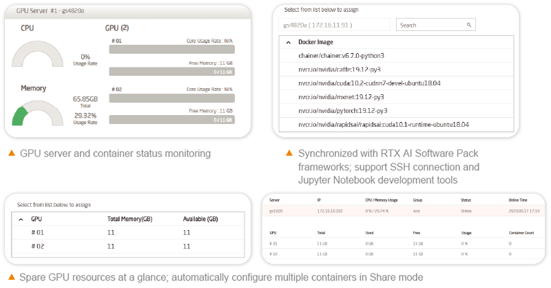 Combined with Leadtek WinFast GPU workstations and servers, GDMS allows you to maximize resource usage, manage your tasks more efficiently, and reduce the total cost of ownership. All kinds of schools, institutions, and corporations will benefit from GDMS in their development environment deployment, no matter it’s an AI development project, an AI training course, or a GPU accelerated application project.