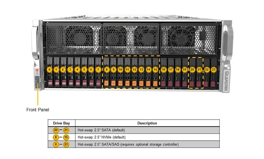 | 24x 2.5" hot-swap NVMe/SATA/SAS drive bays (8x 2.5" NVMe and 2x SATA drives supported by default) |