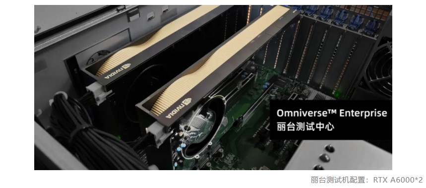 硬件方面,Omniverse™ Enterprise丽台测试中心配置了两台测试机,每台测试机配置了2片NVIDIA RTX A6000专业显卡以供测试。