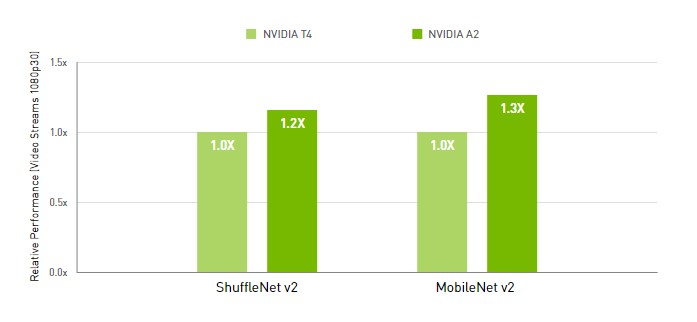 在智慧城市、制造和零售等智能边缘用例中,搭载 NVIDIA A2 GPU 的服务器最高可将性能提升 1.3 倍。与前几代 GPU 相比,运行 IVA 工作负载的 NVIDIA A2 GPU 最高可将性价比和能效分别提升 1.6 倍和 10%,从而改善部署效率。