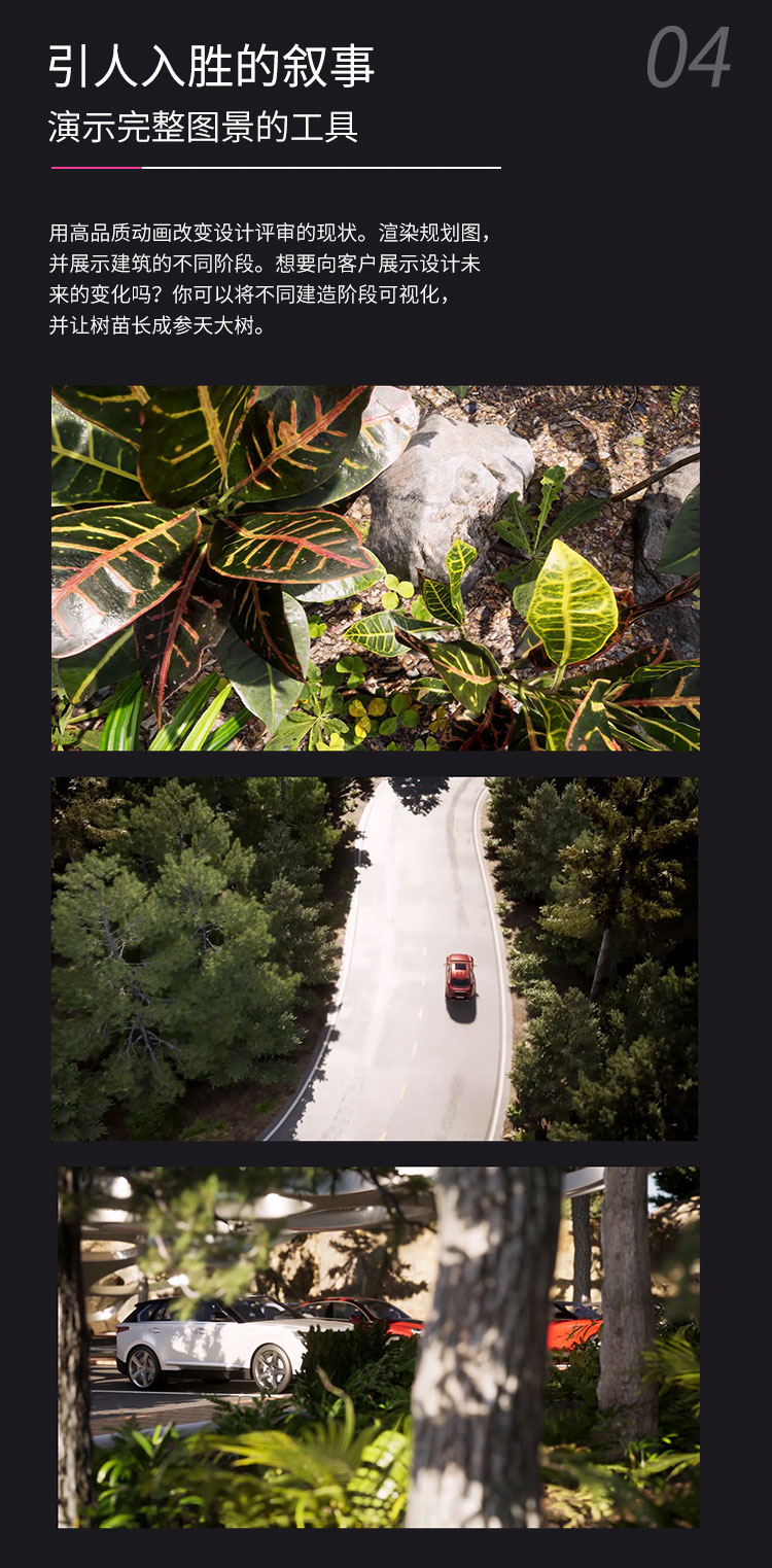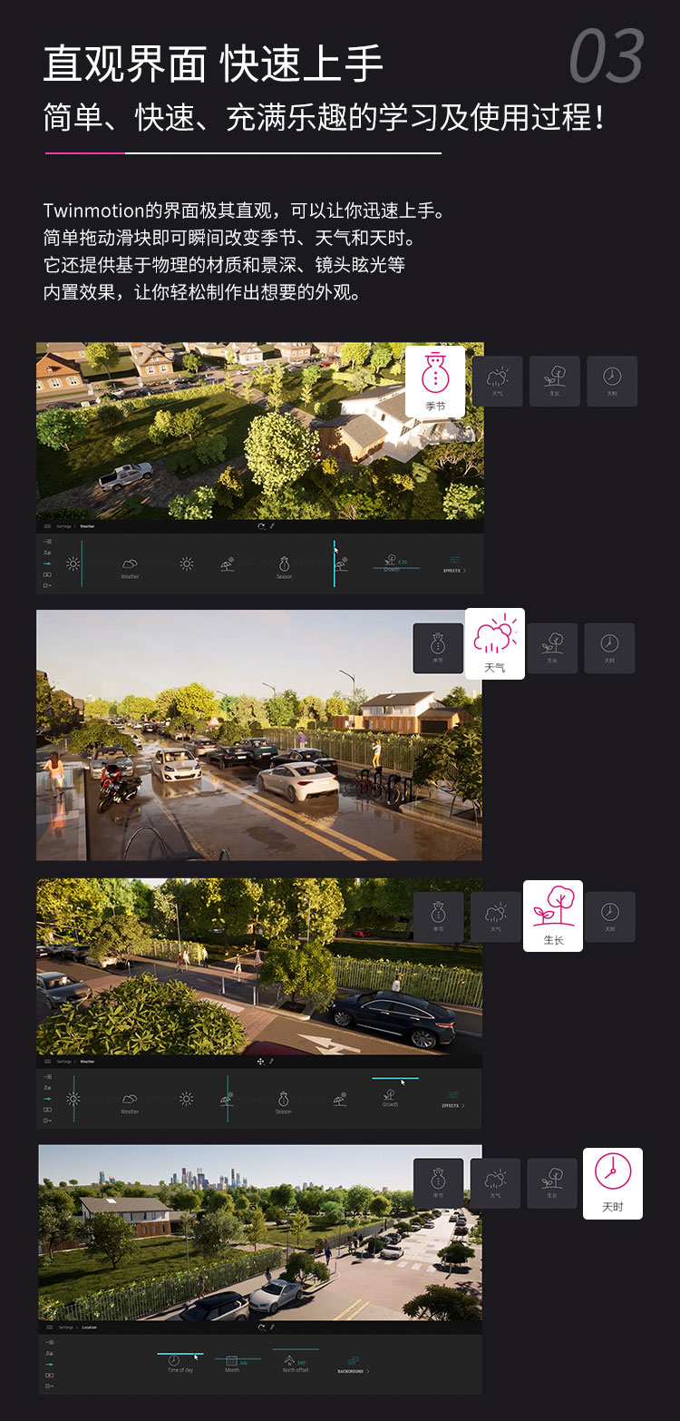 Twinmotion 是一款专为建筑需求而设计的即时可视化工具,它非常方便灵活,能够完全集成到AEC行业的工作流程中。 作为一款解决方案,Twinmotion结合了直观的图标式界面和虚幻引擎的力量,更适合建筑、工程、施工城市规划、景观及影视动画等领域的专业人士。
