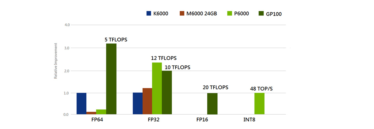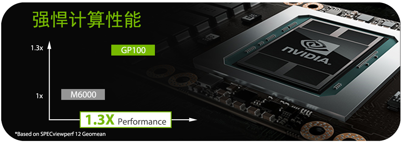 GP100 GPU 是桌面型工作站最多功能的计算加速器,在FP64双精度浮点计算可达超过5 TFLOPS的性能,FP32单精度浮点计算可达超过10 TFLOPS 性能,以及在FP16半精度浮点计算可达超过20 TFLOPS 性能,完美支持高计算密集度的工作