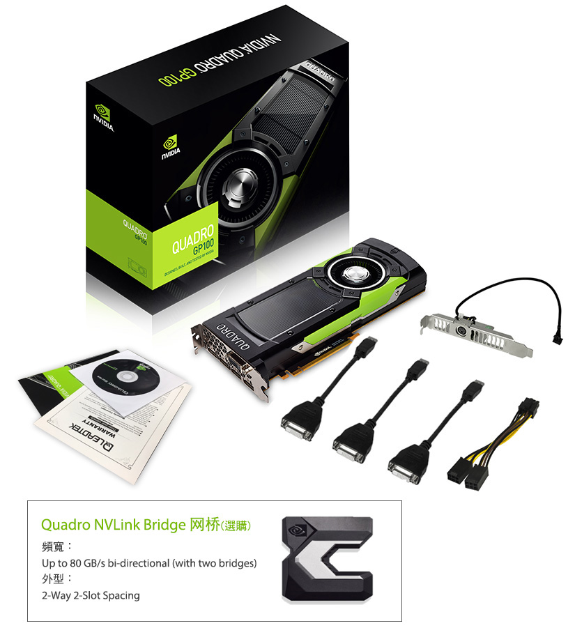NVLink 技术使用NVLink网桥连接两张GP100 ,加速GPU-GPU双向资料传输达80 GB/s ,以拓展专业应用性能