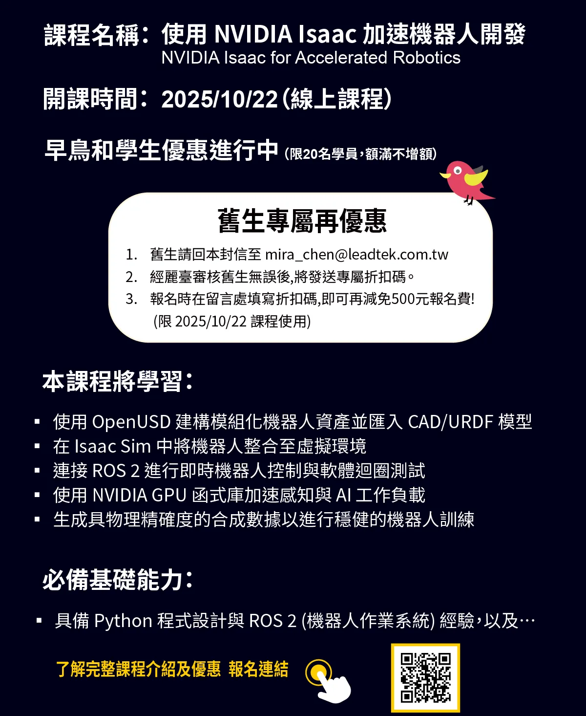 NVIDIA DLI 認證課程 開放報名 (10/22) 使用 NVIDIA Isaac 加速機器人開發
