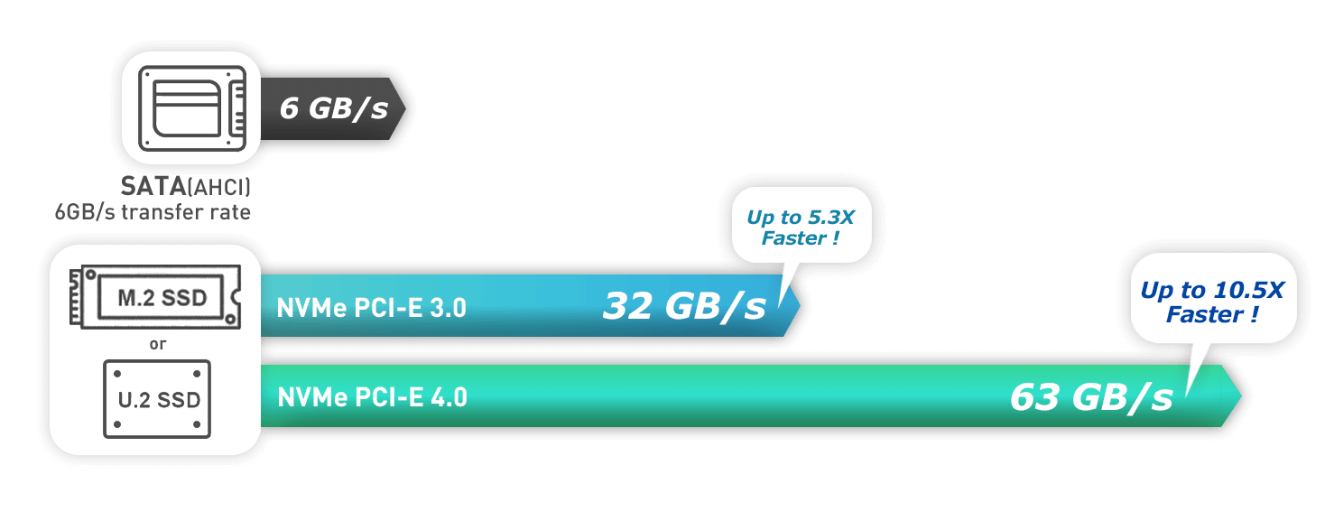 PCIe 5.0 擁有較 PCIe 4.0 雙倍的 I/O 頻寬.您可以使用 128 條 I/O 通道將連接 HPC 集群的網絡頻寬增加一倍,並滿足資料傳輸的巨大需求。關於其他應用程序需求和虛擬化環境,您可以以更高的速度連接到 GPU 加速器、NVMe 磁碟等。