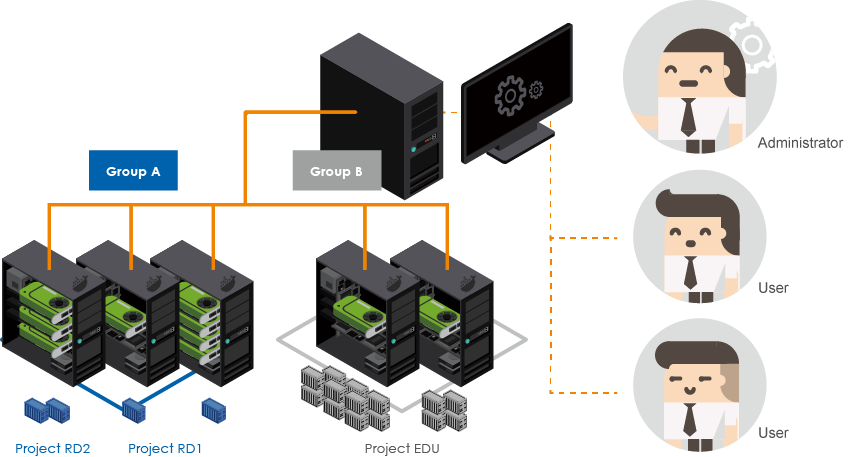 | GPU Server Resource Management Mode | GDMS allows software administrators to manage all the created projects and containers located in GPU servers. Distribute GPU resources through two project/container modes: