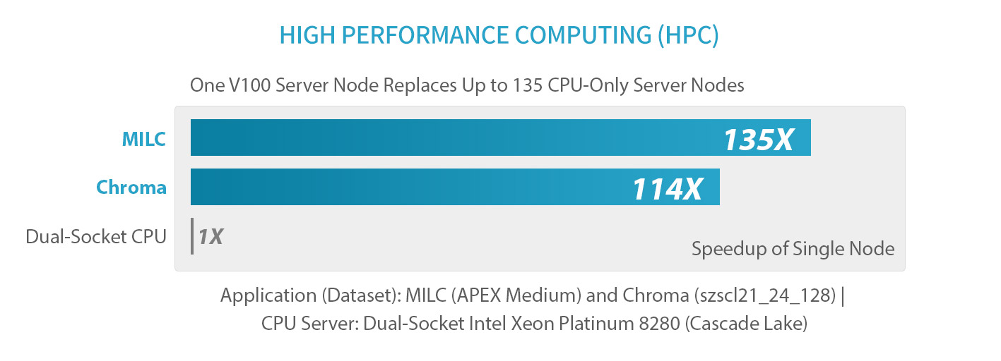 V100 is engineered for the convergence of AI and HPC. It offers a platform for HPC systems to excel at both computational science for scientific simulation and data science for finding insights in data. By pairing NVIDIA CUDA® cores and Tensor Cores within a unified architecture, a single server with V100 GPUs can replace hundreds of commodity CPU-only servers for both traditional HPC and AI workloads. Every researcher and engineer can now afford an AI supercomputer to tackle their most challenging work