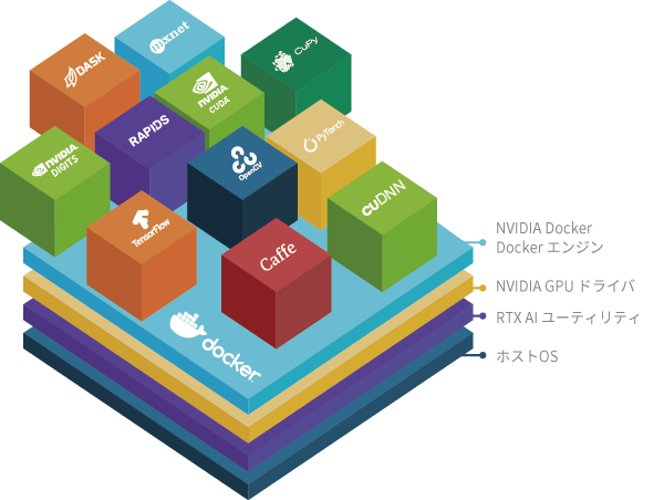 Ubuntu デスクトップ OS v24.04 LTS、NVIDIA CUDA、NVIDIA cuDNN、NVIDIA NCCL、NVIDIA Docker、Docker エンジン、NVIDIA ドライバ | |