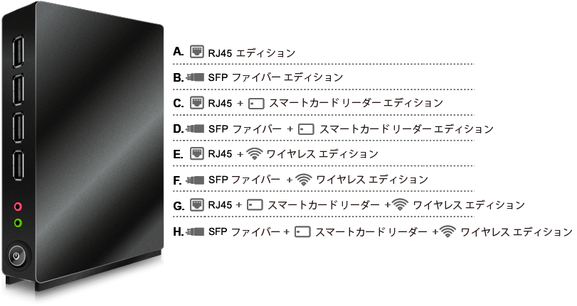 | 製品内容物 | (ウルトラ) シンクライアント 19V 電源アダプターと電源ケーブル イーサネットケーブル(オプション) クイックインストールガイド |