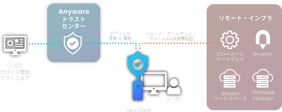 次世代のTrusted Zero Clientテクノロジーは、PCoIP ゼロクライアントの強固な基盤の上に構築され、リモート・セキュリティとPCoIP Ultraパフォーマンスにおいて最高の性能をもたらし、ITがZero Trustアーキテクチャをデジタル・ワークスペース環境に統合するのを支援します。これは、安全な信頼できる接続を可能にするために継続的にアクセス動作を検証し、信頼できるデバイスのセキュリティ・ポリシーを作成するゼロ・トラスト・ポリシー・エンジンであるAnyware トラストセンターと統合されたデバイス管理ツールによって管理されます。
